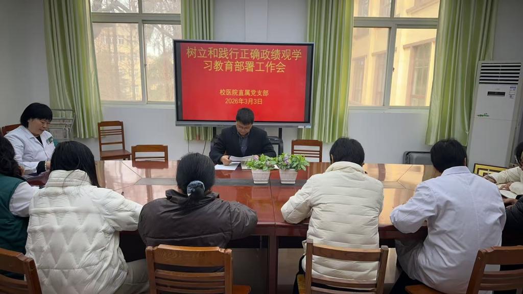 2026年3月3日下午,校医院直属党支部在医院会议室部署开展树立和践行正确政绩观学习教育,会议由直属党支部书记张景伟主持,全体党员干部参加。