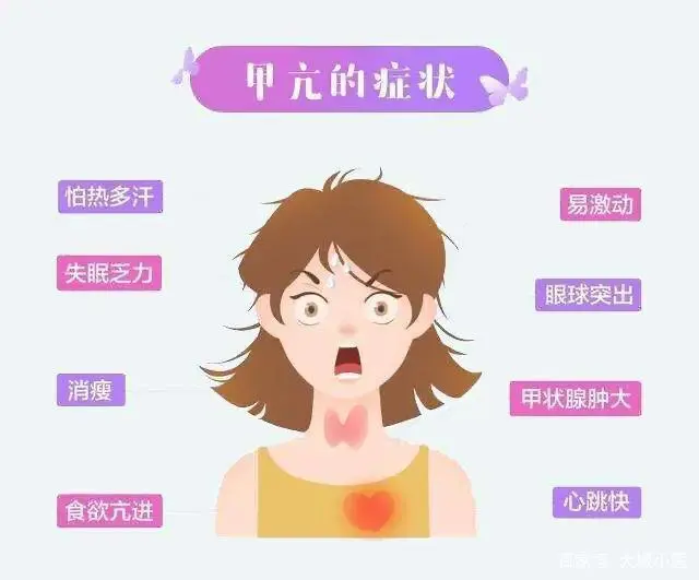 体重下降、烦躁、焦虑,爱生气、心跳快(每分钟可超过100次)、眼睛突出、凝视、手颤、感觉特别疲劳乏力、脱发、便次增多、指甲长速变快、爱出汗、月经异常等。